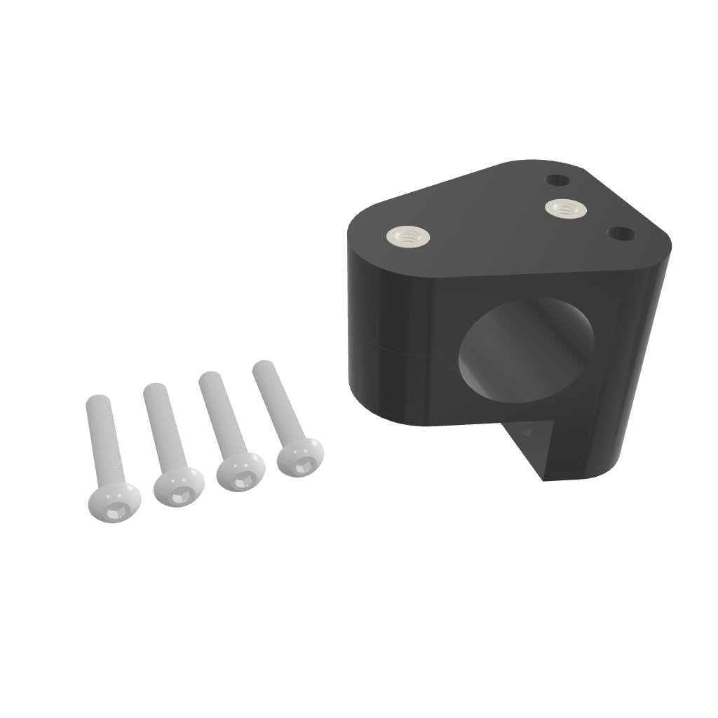 The corner bracket comes with four stainless steel screws (A4 - 316 Marine Grade), is 3D printed with UV resistant PETG plastic and contains six brass threaded inserts. Two bolts clamp the bracket to the aluminum tube of the seat and the other two stainless bolts let you pick from four additional inserts to bolt accessories to the front and side of your seat.